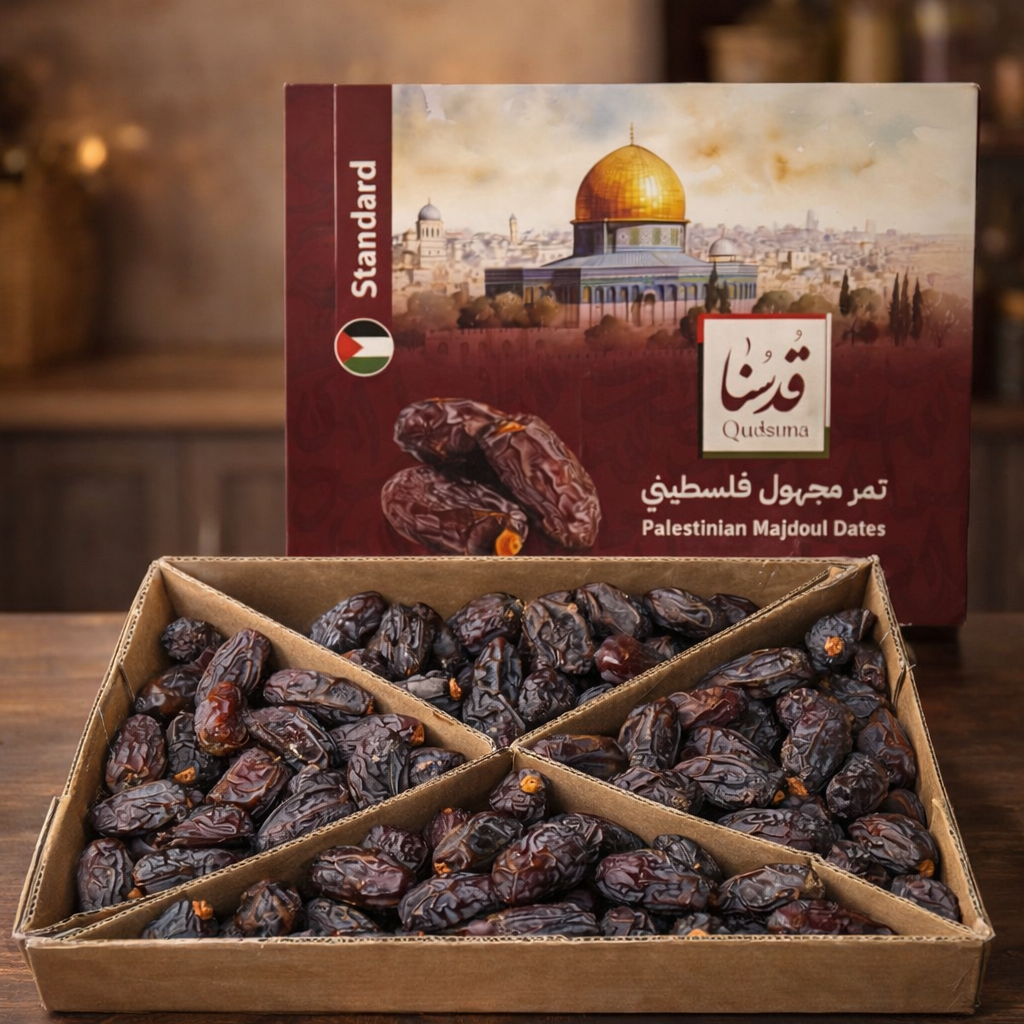 Palästinensische Medjul (Medjoul) SPEZIALITÄT: Schwarz, recht groß und dünnhäutig. Sie ist sehr süß, faserig, fleischig und weich. Sie gehört zur Sorte Medjul, auch bekannt als Jerusalem-Dattel. Sie hat kleine Kerne. Wir empfehlen diese 100 % palästinensische Sorte wegen ihres köstlichen Geschmacks.